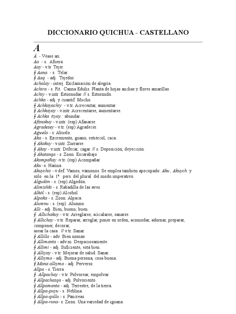Fast accurate and secure translate texts and full document files instantly. El Ministerio de Educacin cree en la vitalidad de las lenguas indgenas y precisamente por esa. Diccionario PDF de palabras en idioma quichua al espaol y del castellano al quichua.